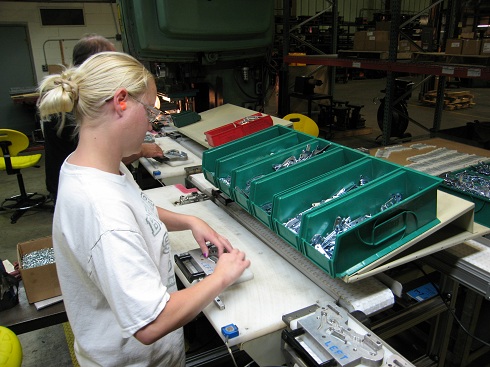 Fortunately, Crane Production Systems Corp., Waukesha, Wis., a distributor of Dorner conveyors and other industrial equipment, offered an ideal solution for WISCO. Crane recommended a Dorner conveyor that WISCO configured in a semi-automated process that would crank out the latches with unmatched accuracy and efficiency. The key to the process was a Dorner 2200 Series conveyor system that recirculated work-holding pallets and secondary operations to progressively assemble, rivet and test the latches. The pallets featured integral anvils as well as spring retainers that allowed difficult staking and assembly operations to be performed quickly and easily.